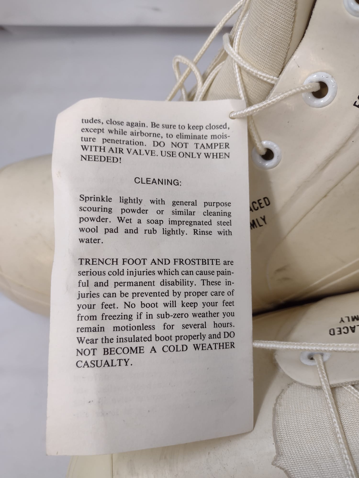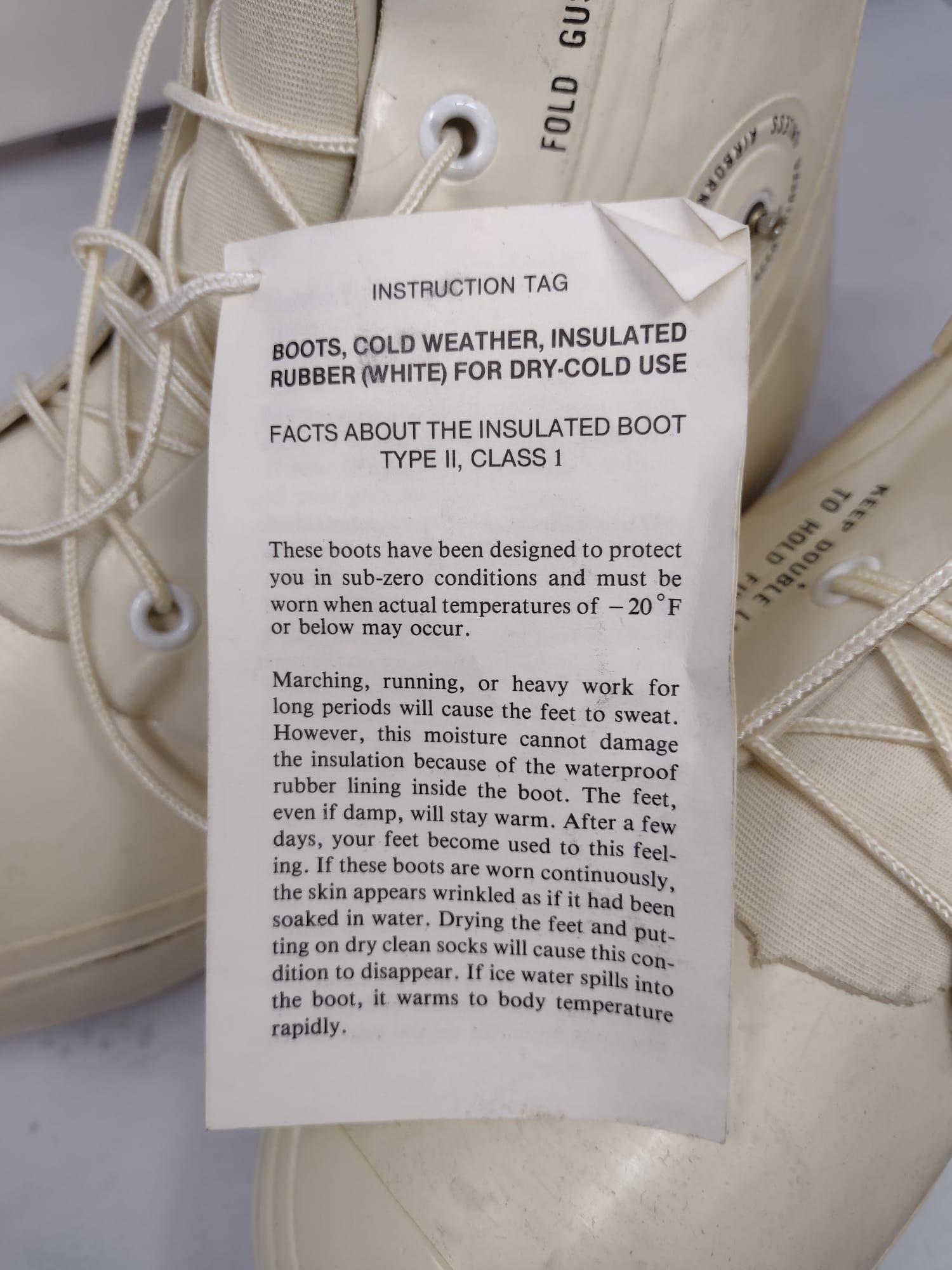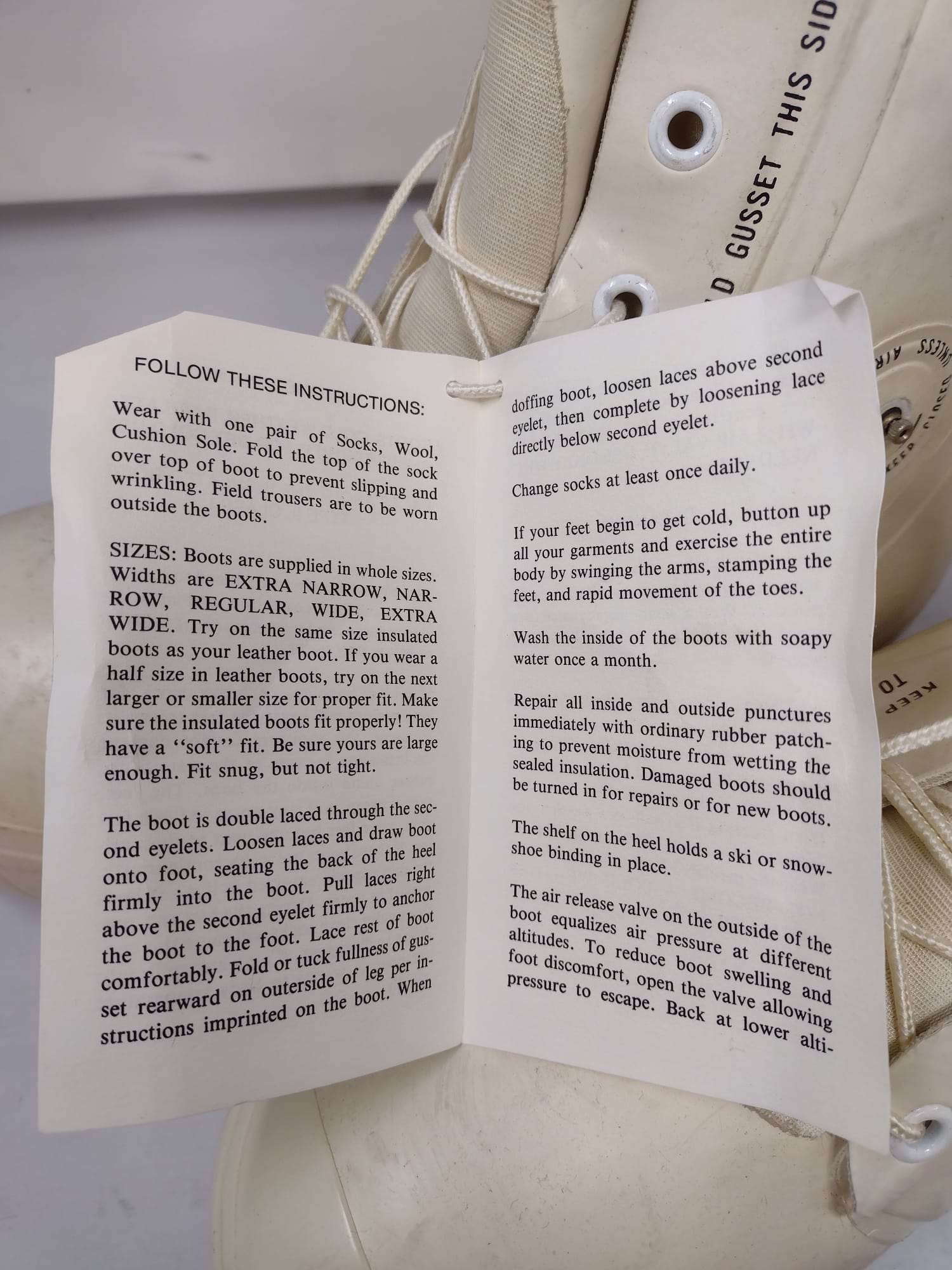 The boots are large and bulbous, intended for wear in extremely cold weather. Like most cold-weather boots, they are a bit oversized, as they are intended to be worn with warm, thick socks. However, they are not designed to be worn with boots liners. Buyers should be aware that the majority of the boots, regardless of condition, have their sizes written in black ink on the back of the heel.
