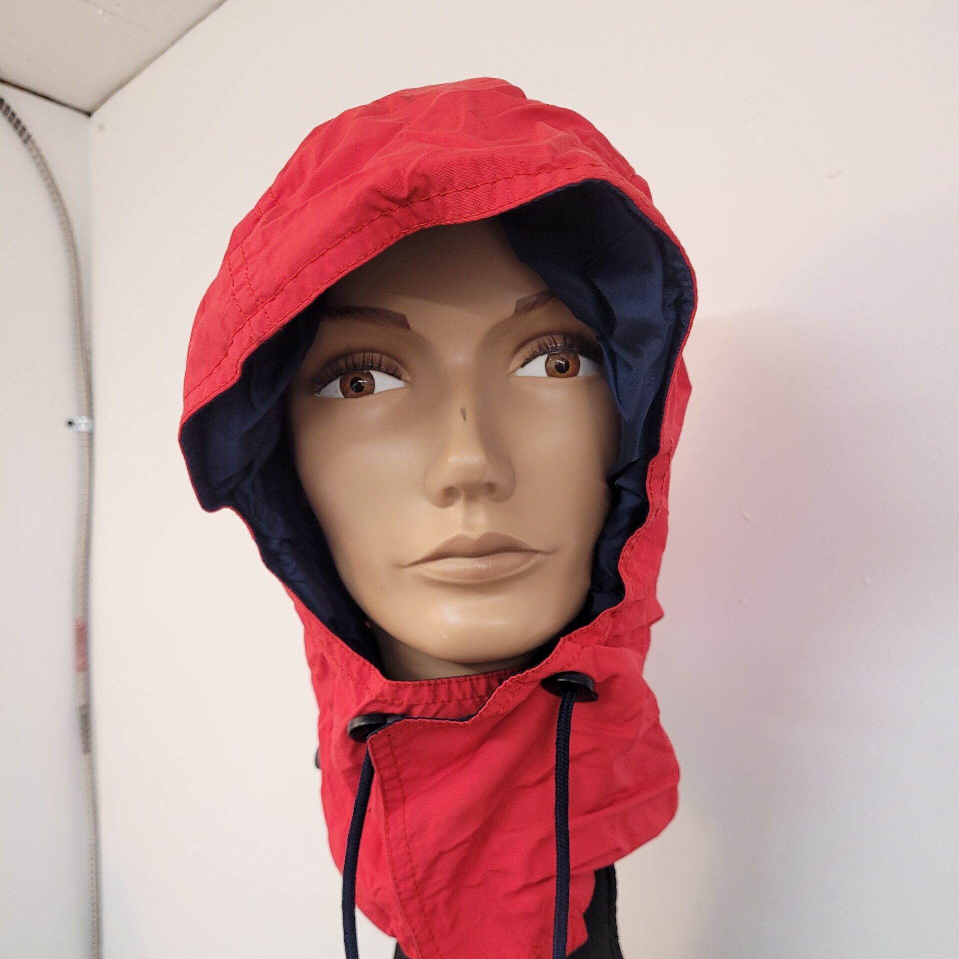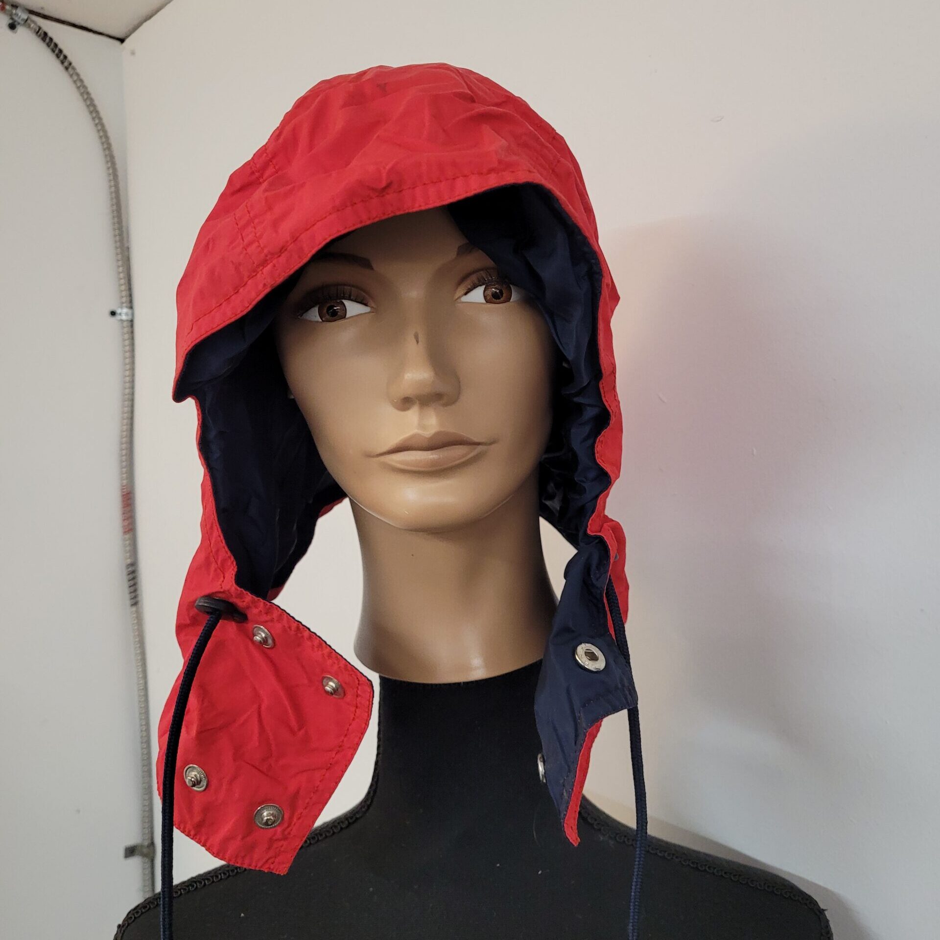 These red removable hoods fit snugly via the drawstring. Most show no tags or indication of brand.