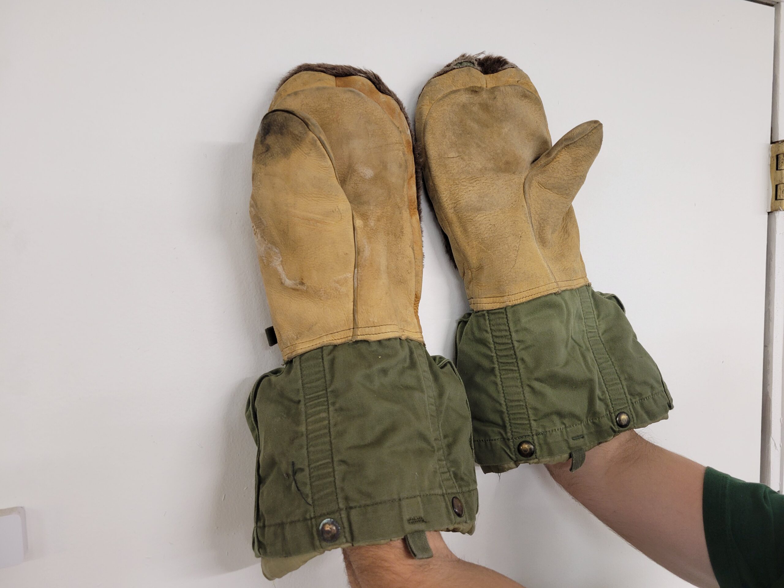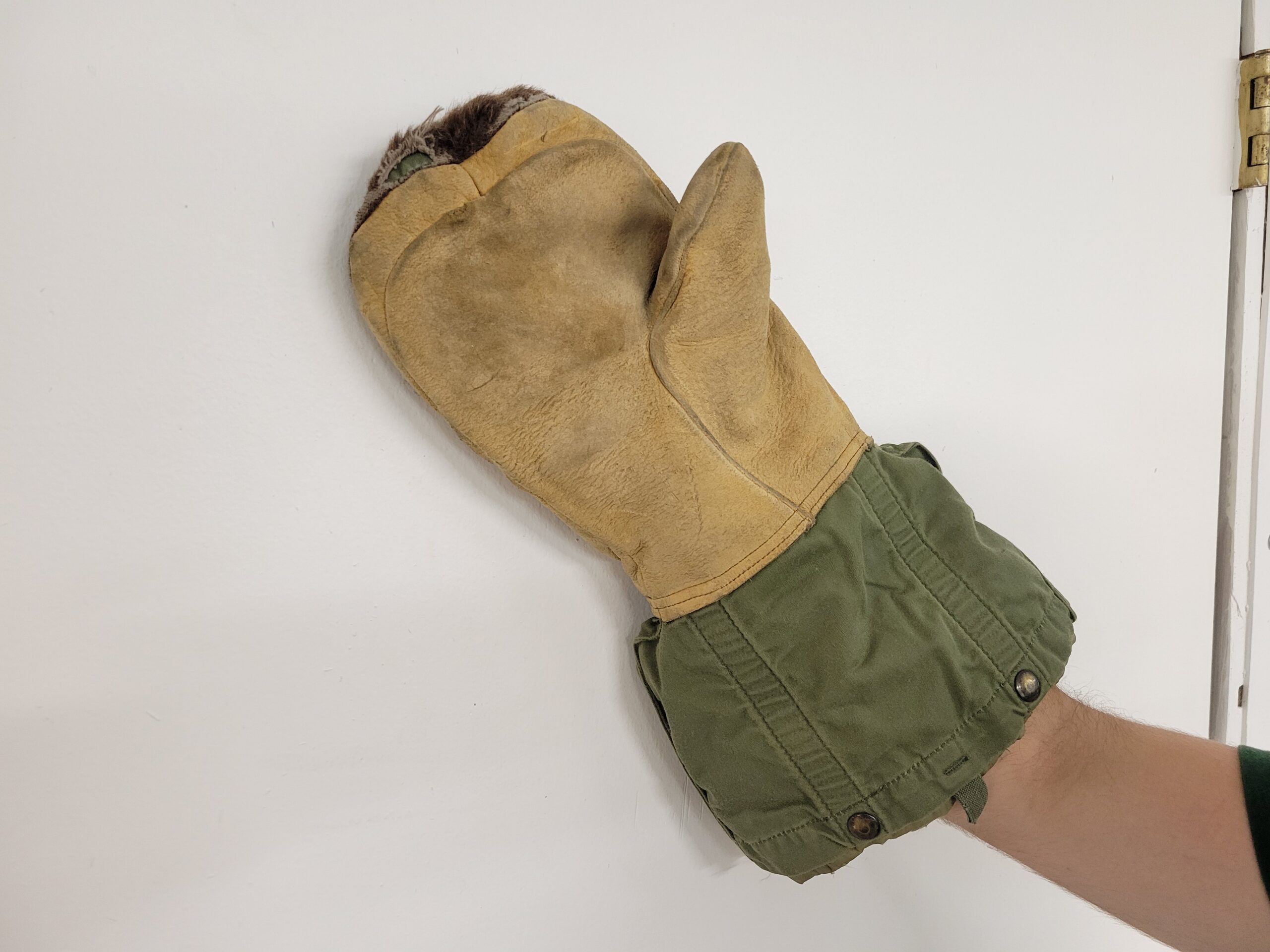 The Military Extreme Cold Weather Mittens are made by the Illinois Glove Company. The mittens extend up the forearm towards the elbow, and feature buckles to hold the arm portion firmly in place to wrist and forearm. They are made of leather and faux fur, with a tough green fabric on the wrist portion.
