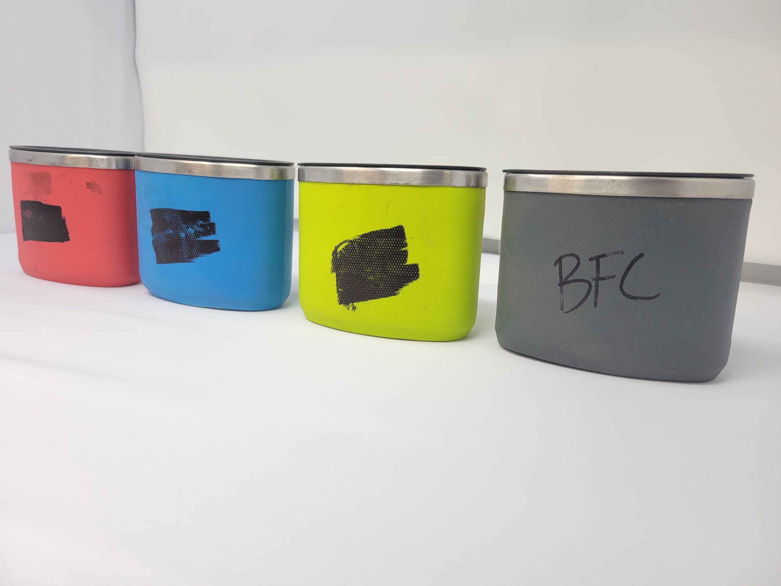 These insulated camping mugs come in four colors: yellow, red, black, and blue. The mugs come with lids included.