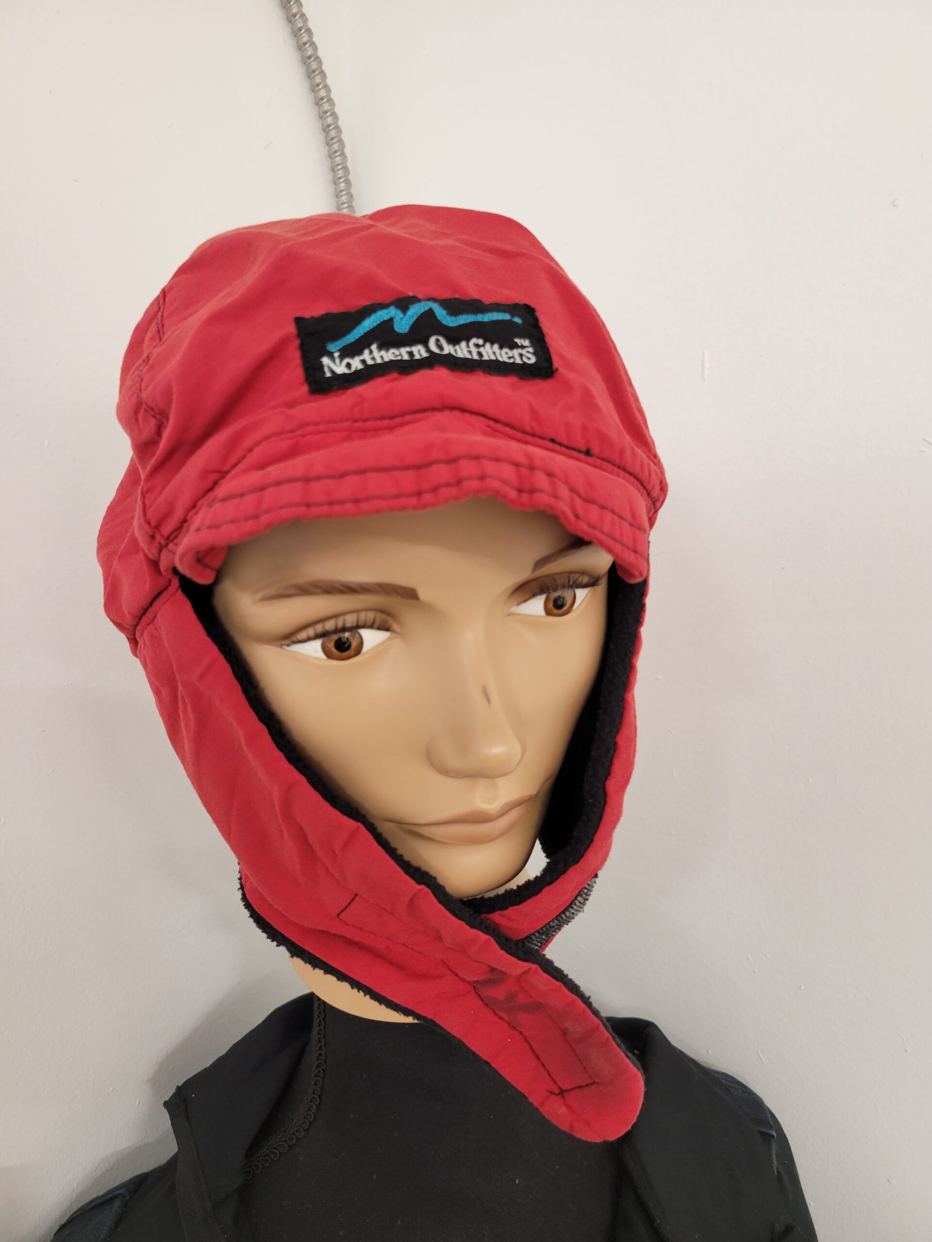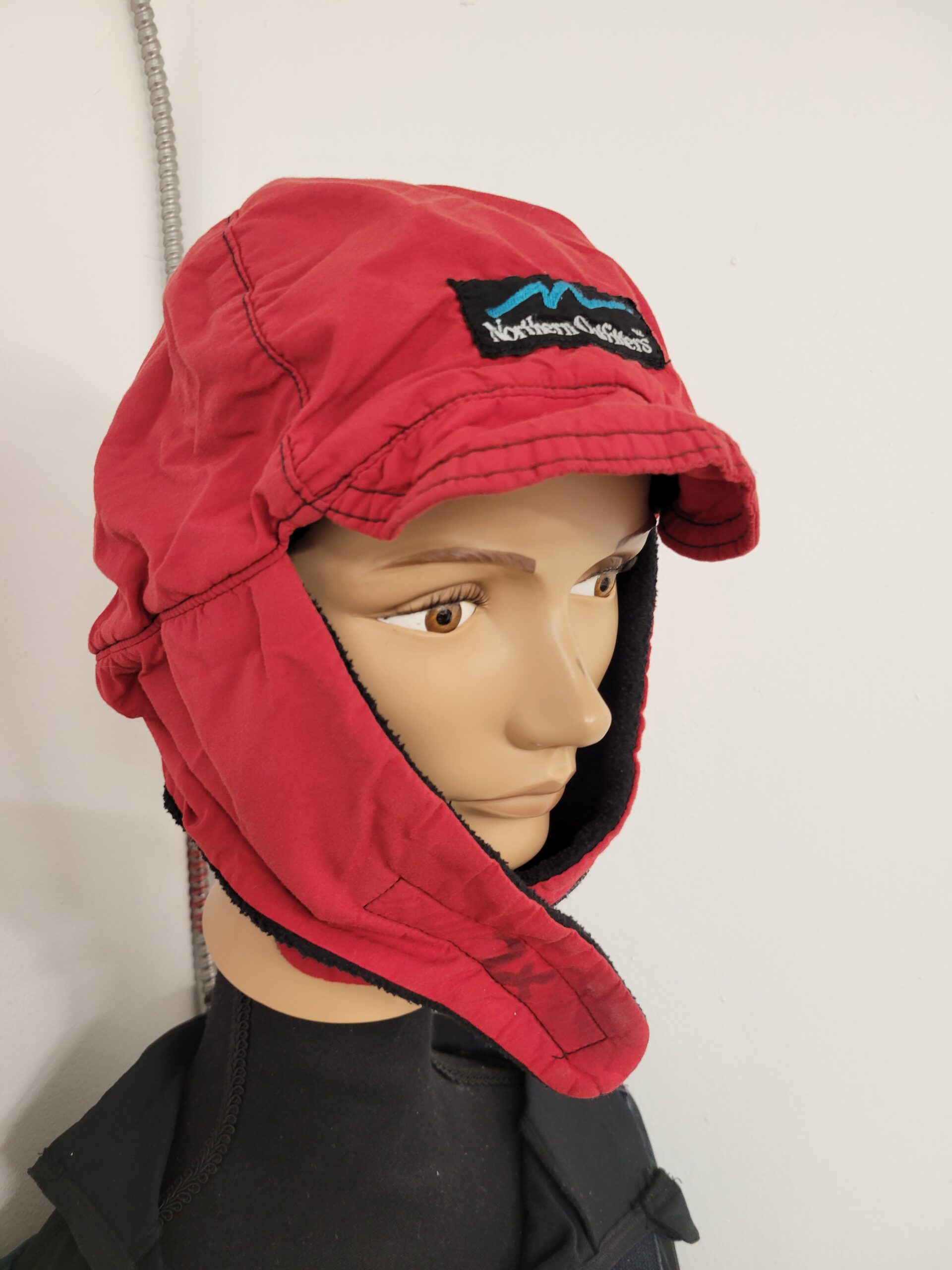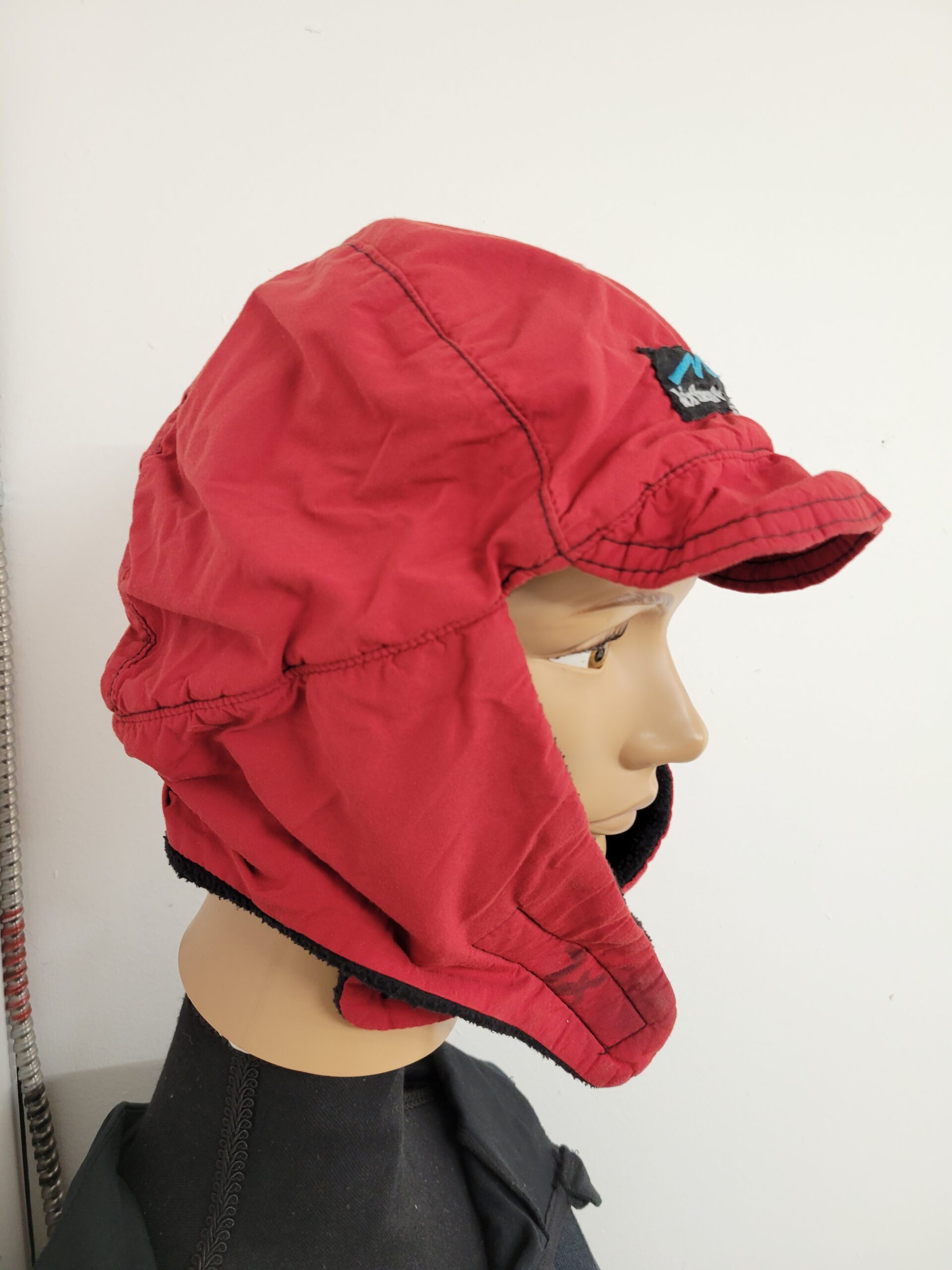 The musher-style hats feature a short, flexible brim and ear flaps which can be fastened under the chin via velcro. The brand logo is on the front of the hat, above the brim.