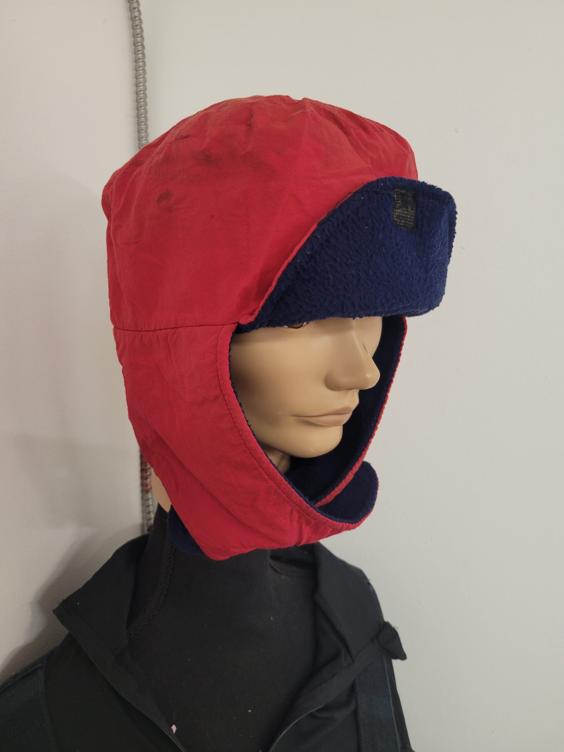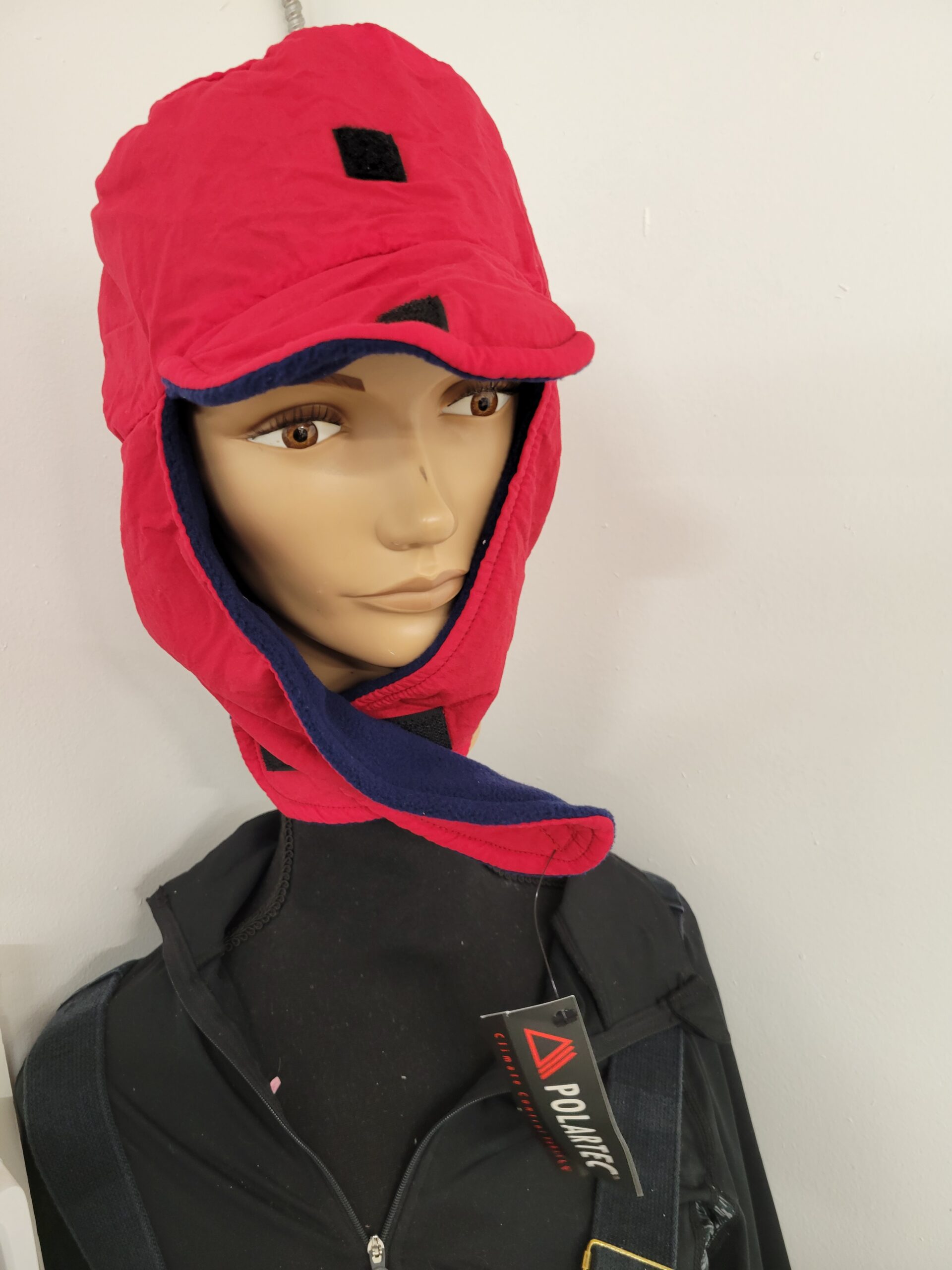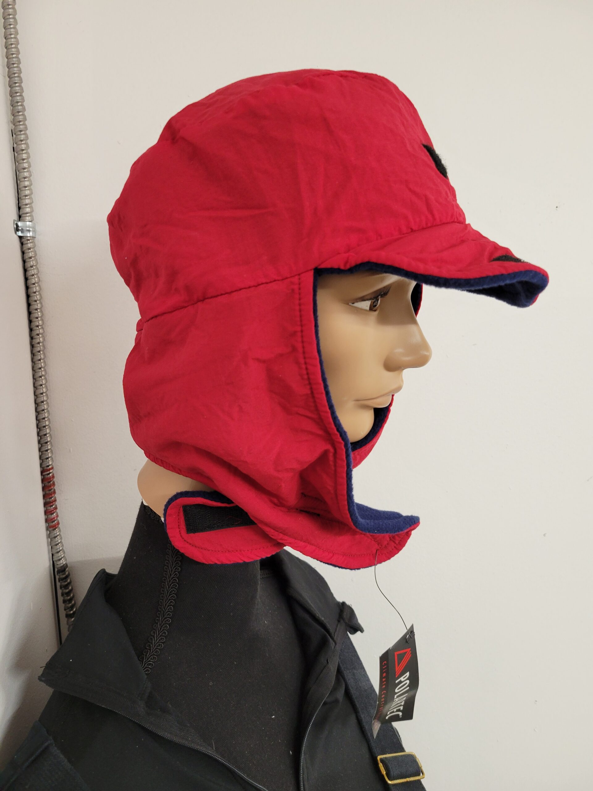 The Polar Tech Musher Hats are red with a dark inner lining. The front and bill of the hat have small pieces of velcro, allowing the bill to put up and out of the way.