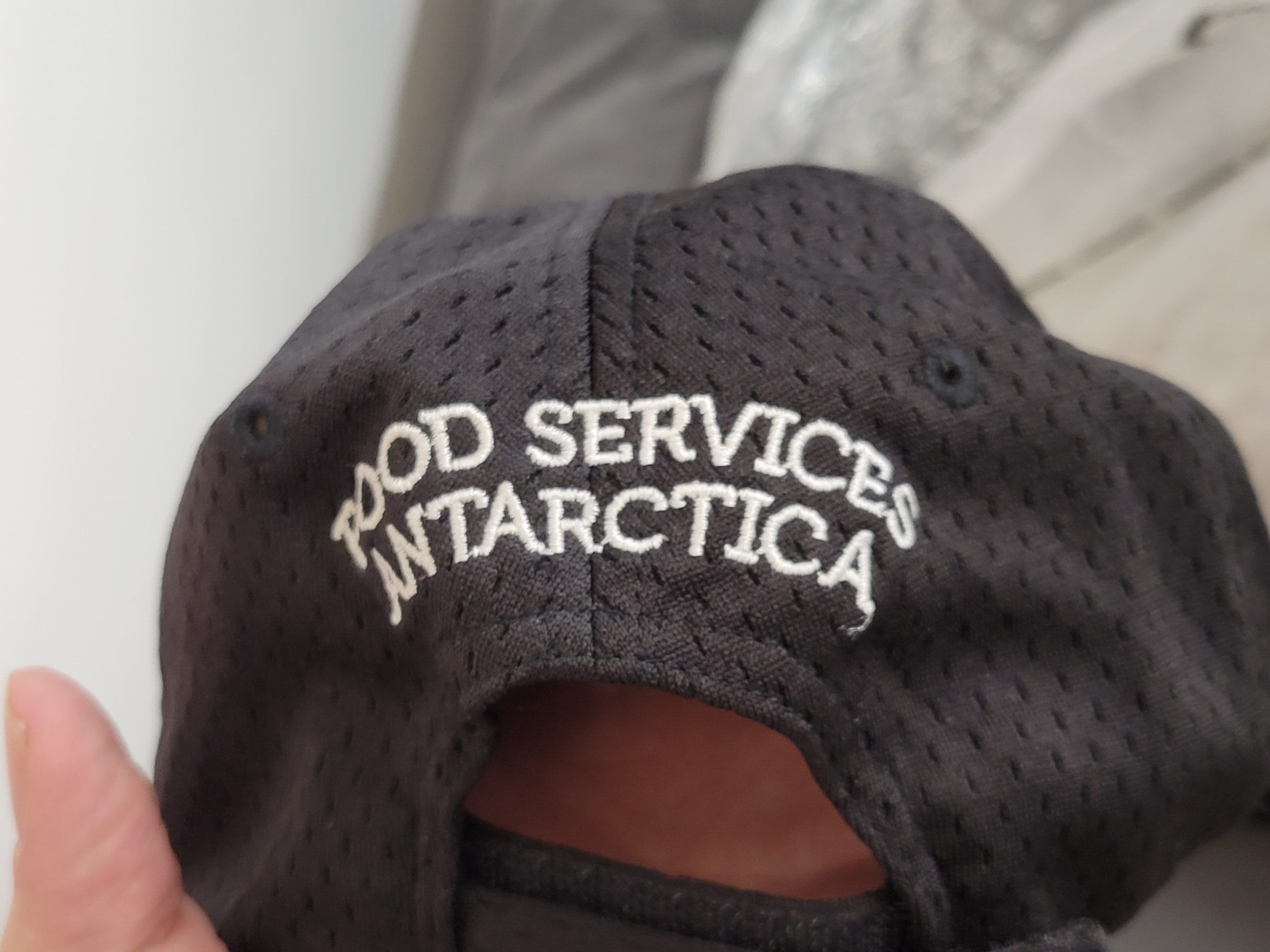 These black uniform baseball caps were worn by USAP cooking staff. The USAP logo is featured on the front, and ‘Food Services Antarctica’ is printed in white on the back.