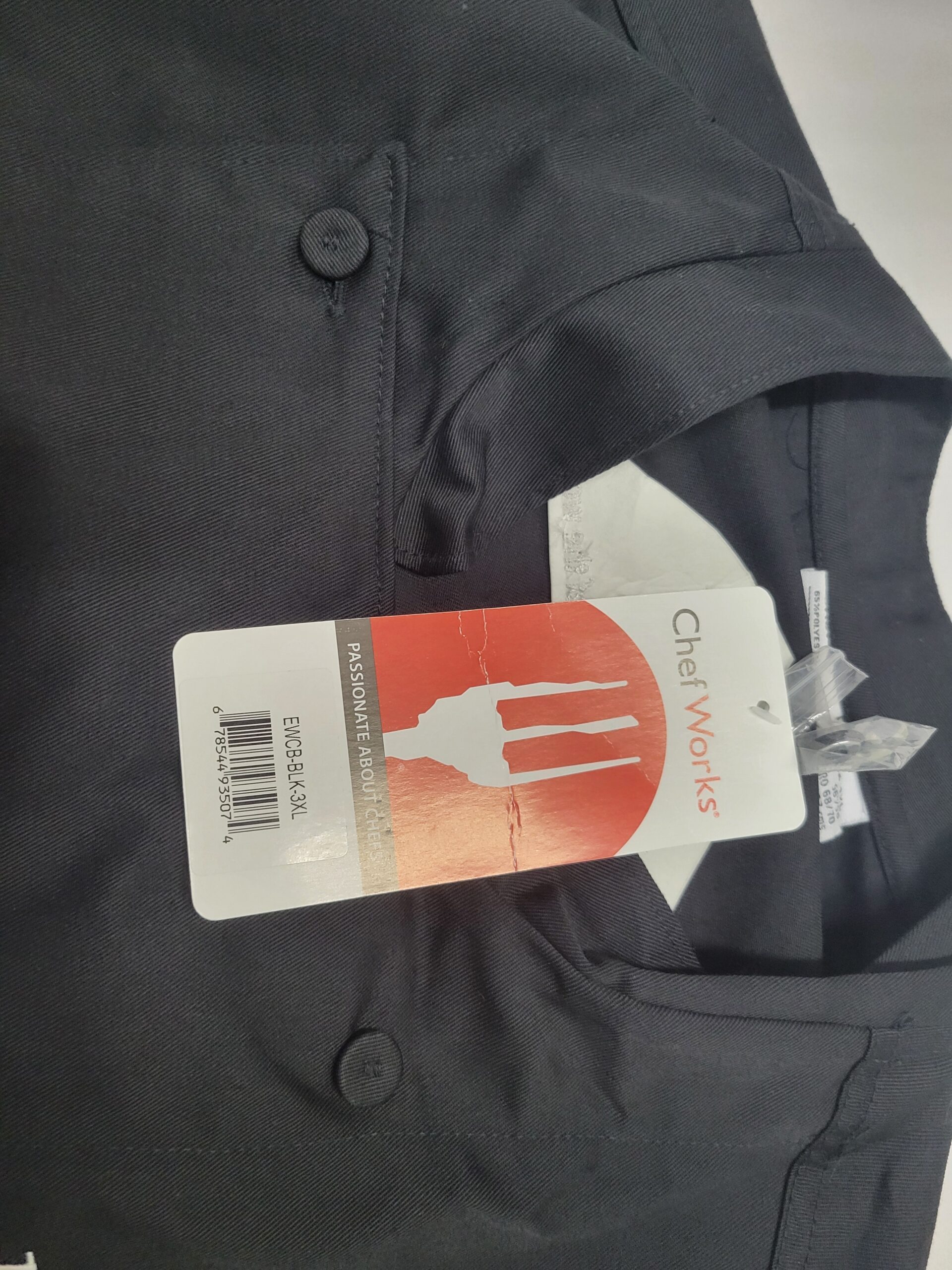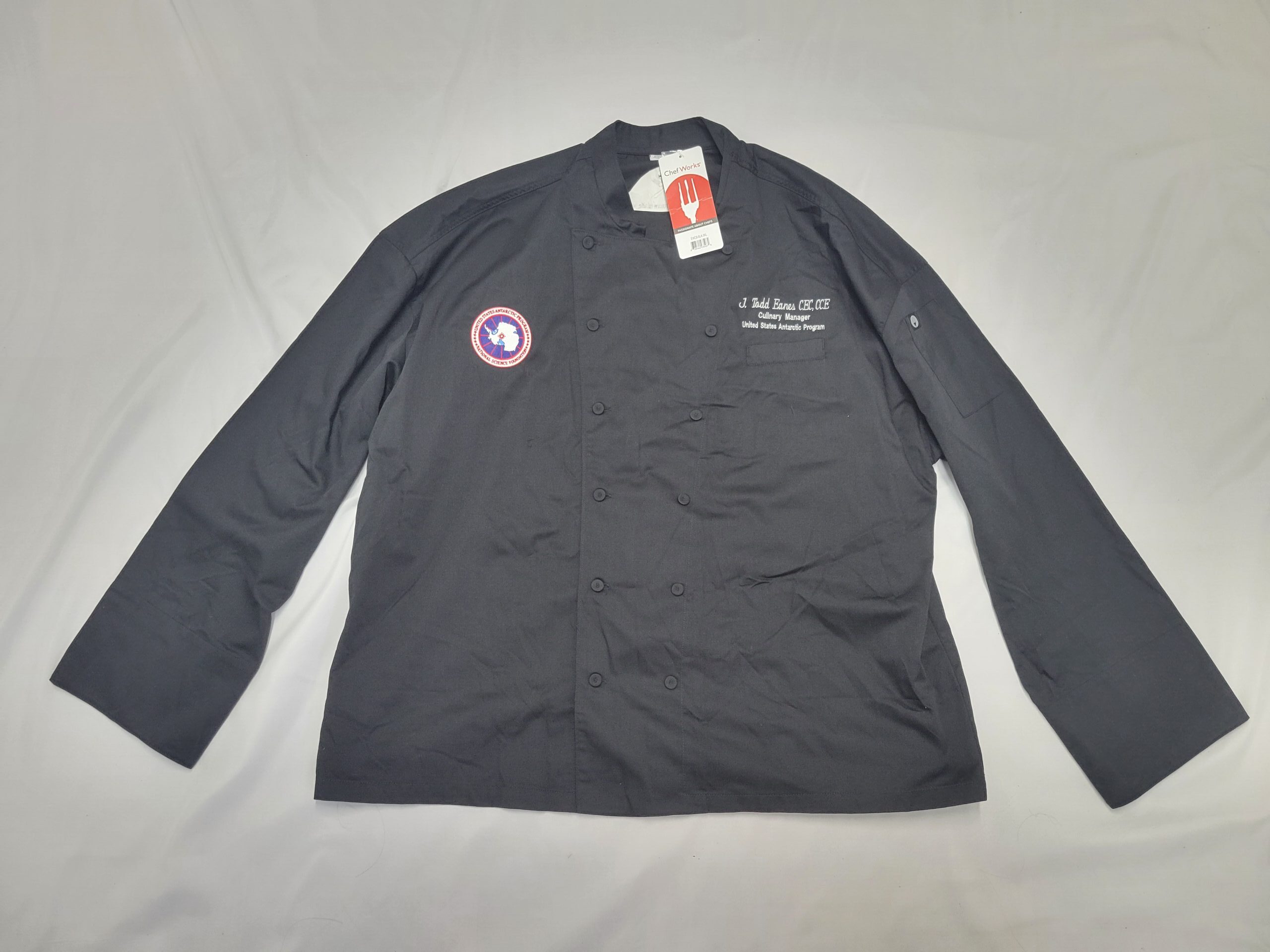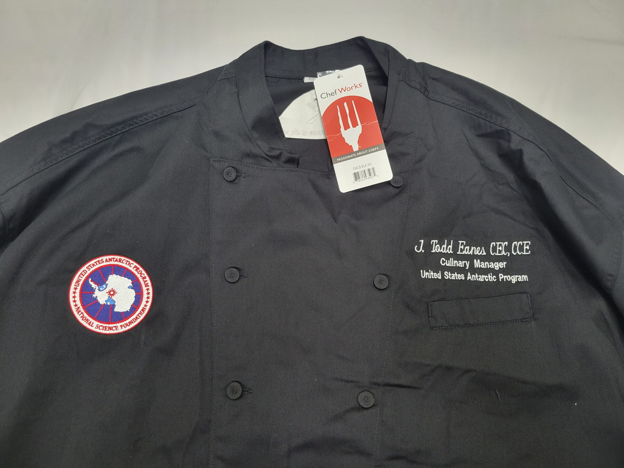 These black Chef jackets are brand new, and all size 3XL. ‘Cooking at the bottom of the world’ is embroidered on the back of the jacket, and the employee’s name embroidered on the breast. Presumably, these uniform jackets belonged to an employee who never wore them. All jackets feature the same name.